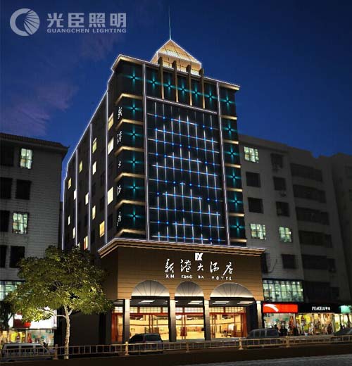 河源新港大酒店屬于外墻翻新工程,初期亮化選用了外控護欄管和點光源作為外墻裝飾燈具,多年后酒店方覺得方案跟不上時代審美,所以重新設計安裝一批新的亮化燈具。