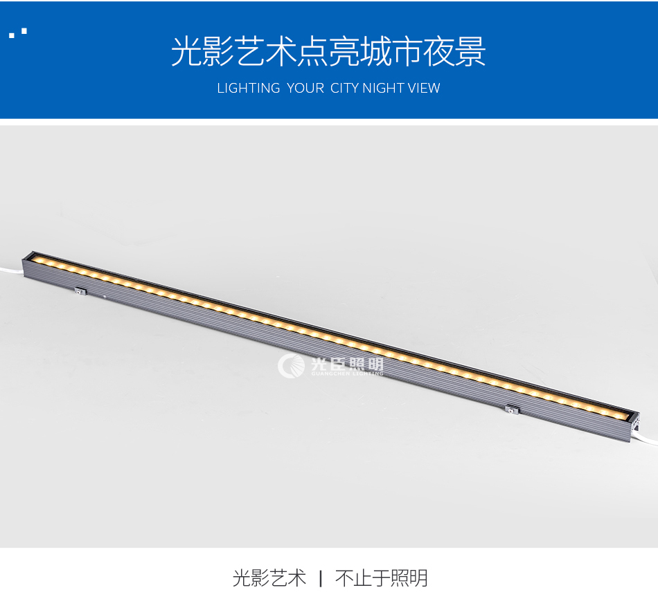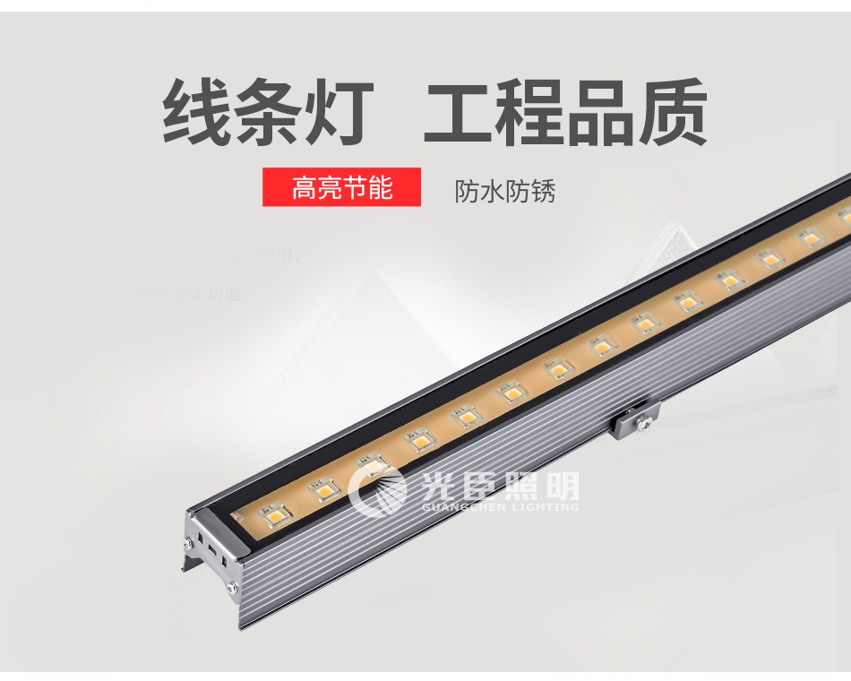 led線條燈即led洗墻燈系列鋁型材燈體,緊湊輕巧端蓋和安裝支架由鋁合金高壓壓鑄耐高溫硅橡膠密封圈,保證防水的可靠性。燈具可單個或多個組合安裝。適用于各種建筑物,室內(nèi)外局部或輪廓照明。