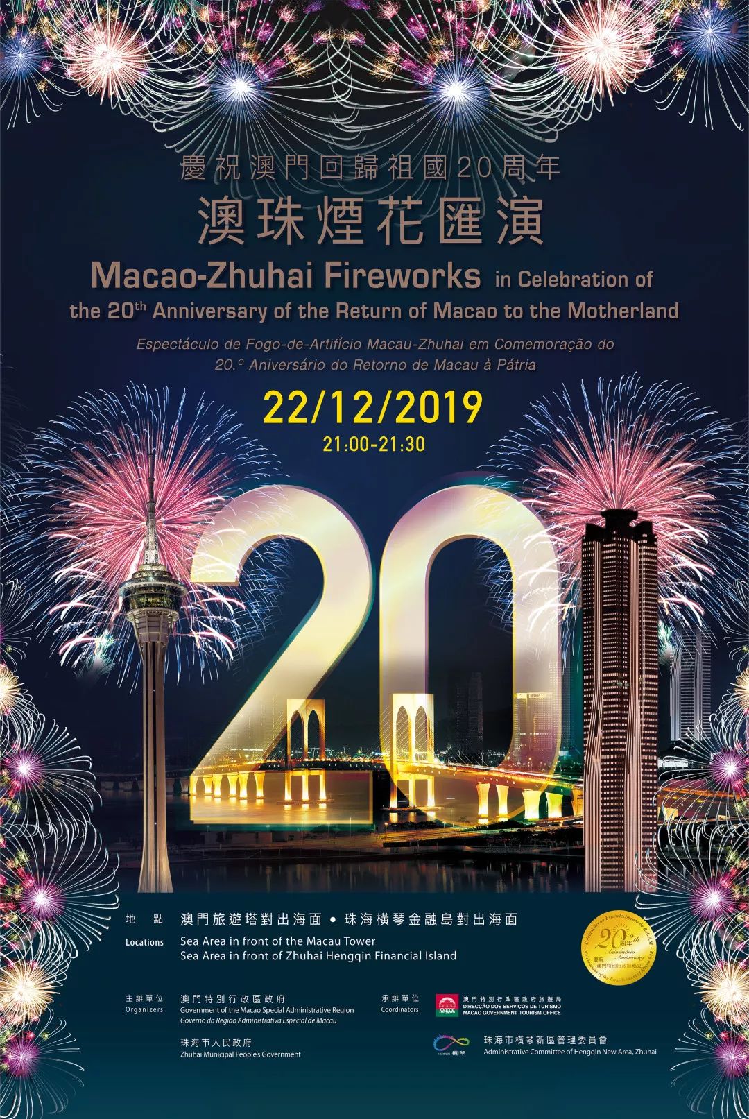 “慶祝澳門回歸祖國20周年澳珠煙花匯演”將于12月22日晚上9時,在澳門旅游塔及珠海橫琴金融島對出海面舉行。屆時,4艘大泊船及16個特效燃放平臺于三十分鐘發(fā)放16萬枚煙花,無人船及無人機亦首次參演。一場壯麗璀璨,寓意團圓歡慶、美滿繁盛的煙花盛典將隆重登場!
