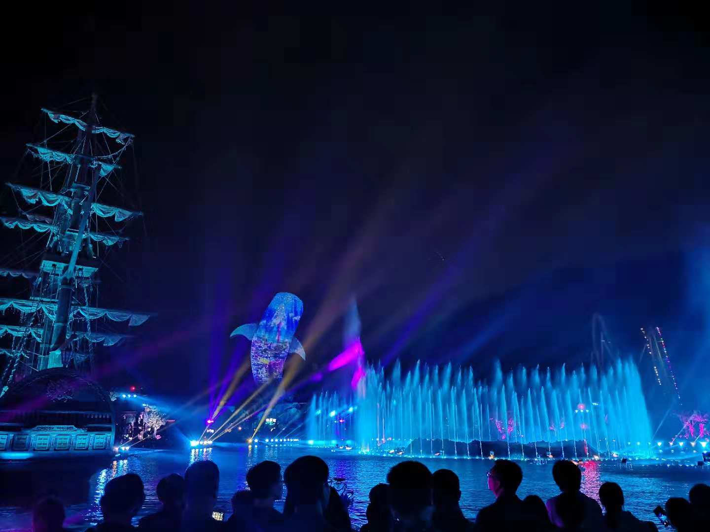 玩了一天,簡單地吃過東西后,晚上欣賞燈光表演和煙花匯演。絢麗多彩的燈光秀結(jié)合煙花表演,洗去了大家的疲憊感。