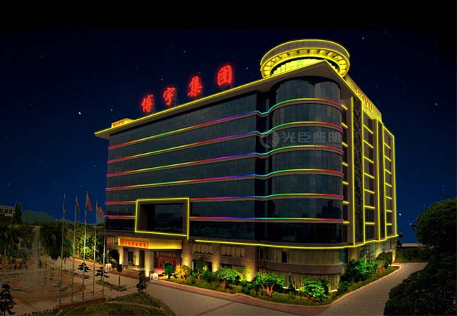 博宇集團是一家水族器材、園林造景配套器材及寵物用研發(fā)、銷售一體的高新技術(shù)企業(yè),其主體辦公大樓更是周邊的地標性建筑。此次亮化工程是屬于換新項目,以前的效果是用白光的高壓PC護欄管做的一個輪廓,效果比較單調(diào),并且由于很多護欄管防水沒做好,壞了很多,所以需要更換全新的亮化燈具。