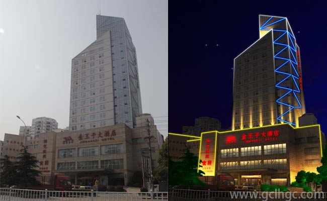 金王子大酒店作為當(dāng)?shù)氐囊蛔貥?biāo)性建筑,酒店方對亮化這一塊非常重視,亮化方案不能太過于浮夸、手法不能太重、耗電不能過大等等,施工方肖總也是方案改了一次又一次,關(guān)于耗電這個(gè)問題也就意味著布燈的數(shù)量不能多,盡量少。但是燈具少了布燈的方案要配合好,不然會(huì)影響整體效果。