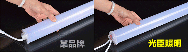 1、PC外殼:光臣照明選用的PC外殼是重量達(dá)到180g~200g的PC管(常規(guī)以180g為主,可定制200g以上重量),產(chǎn)品厚度均勻透光性及抗壓能力好。和市面上的80~90g標(biāo)價8元/米的LED數(shù)碼管質(zhì)量相比,沒有可比性。