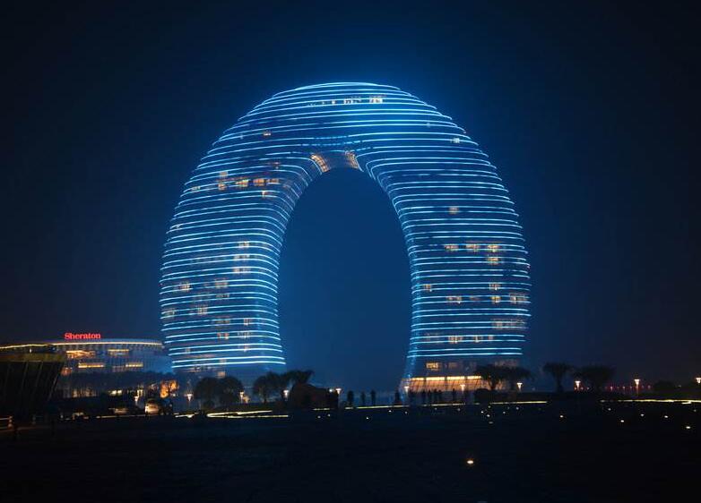 當然,也有的酒店是造型特殊,地標性極強的,適合豐富多彩的亮化設(shè)計,如用全彩的洗墻燈或者線條燈做動態(tài)效果。