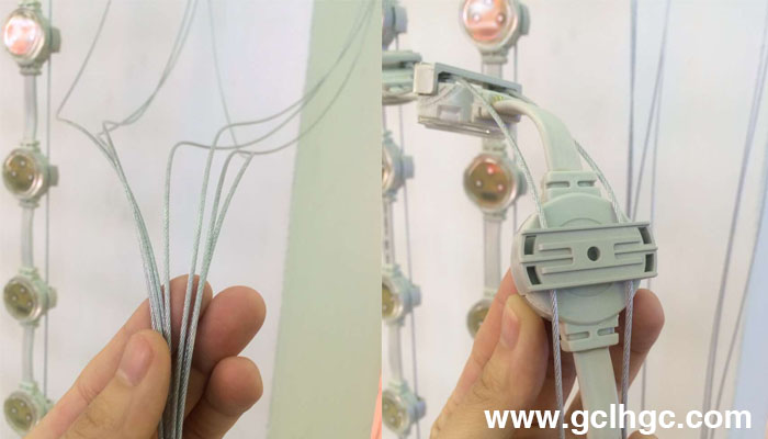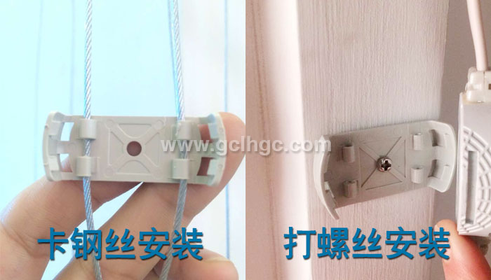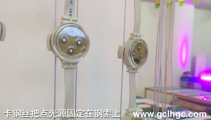 (1)卡鋼絲固定安裝:對于卡鋼絲安裝相信大家也不陌生了吧,聽了很多但是可否有親眼目睹過實(shí)際的安裝模樣呢,圖片上所示的就是卡鋼絲安裝所用的材料和效果。鋼絲固定安裝主要針對一些玻璃幕墻的建筑樓體,玻璃與墻體之間拉下鋼索后對點(diǎn)光源進(jìn)行固定。