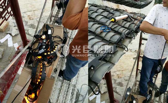 大部份瓦楞燈的安裝都選擇第二種安裝方法。以上是我們貴州的一個旅游景區(qū)在安裝LED瓦楞燈的圖片。工作們把瓦楞燈先串接好后再把鋁片調(diào)整好角度進(jìn)行粘合。