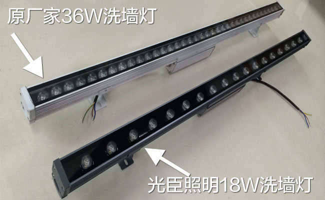 所有的替換產(chǎn)品,LED洗墻燈廠家光臣照明均要求客戶寄來原產(chǎn)品進(jìn)行檢測和技術(shù)參數(shù)分析,該產(chǎn)品是市面上的公模產(chǎn)品,與光臣照明的一些公模產(chǎn)品相比無論從款式和尺寸都是一樣的,所以說原廠家用料還是比較注重質(zhì)量,但是該洗墻燈有一個致命弱點(diǎn)!就是功率和外殼尺寸相差甚遠(yuǎn),導(dǎo)致燈具熱散慢、光衰快和損壞率高。